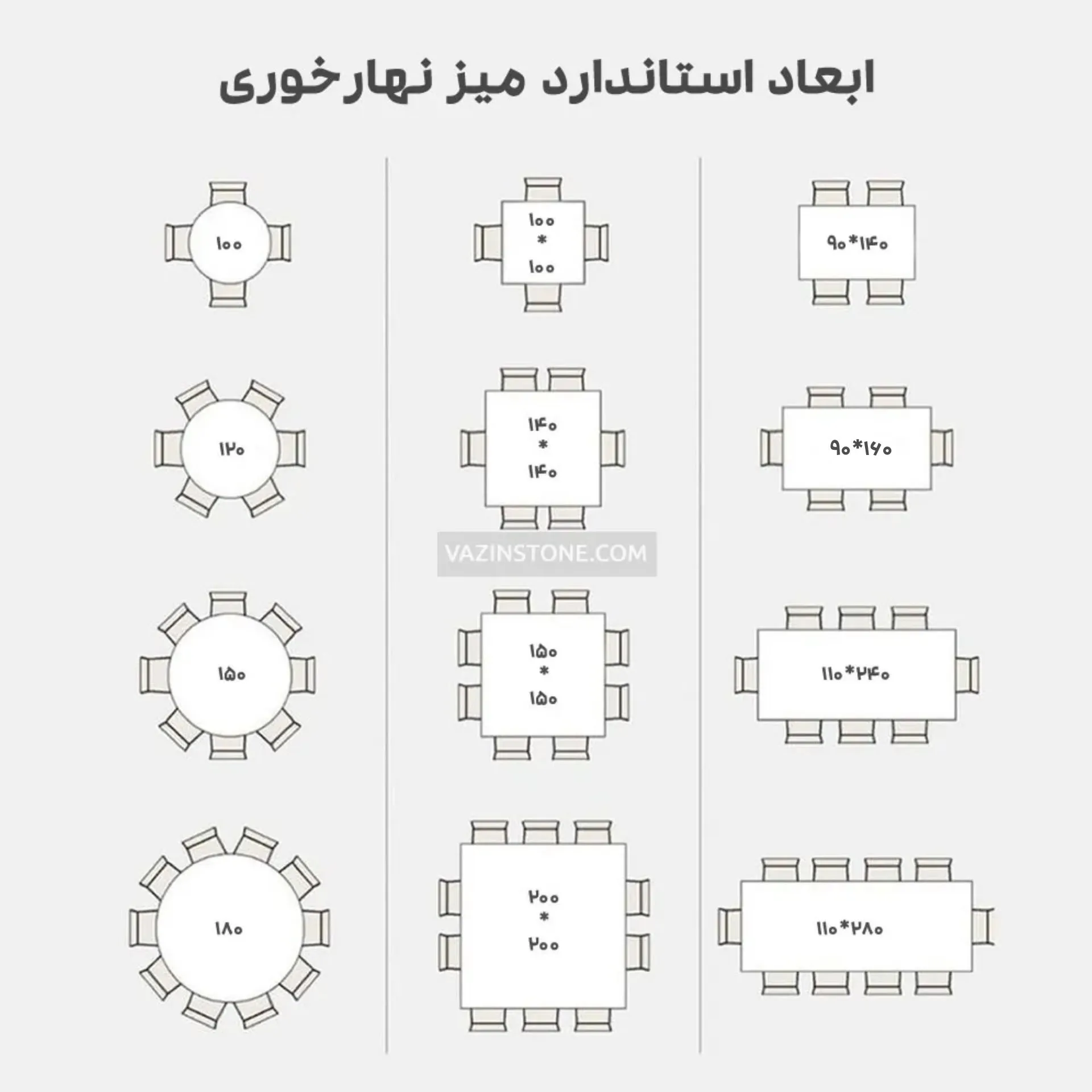 میز های سنگی شامل میز ناهارخوری، میز عسلی و میز جلوی مبل و استند می باشد که هرکدام بر اساس یک استاندارد کلی با یک اندازه کلی ساخته شده و تنها در مواقع خاص ممکن است که این وسایل اندازه ای متفاوت داشته باشند. در ادامه به بررسی ابعاد این نوع میز ها می پردازیم: