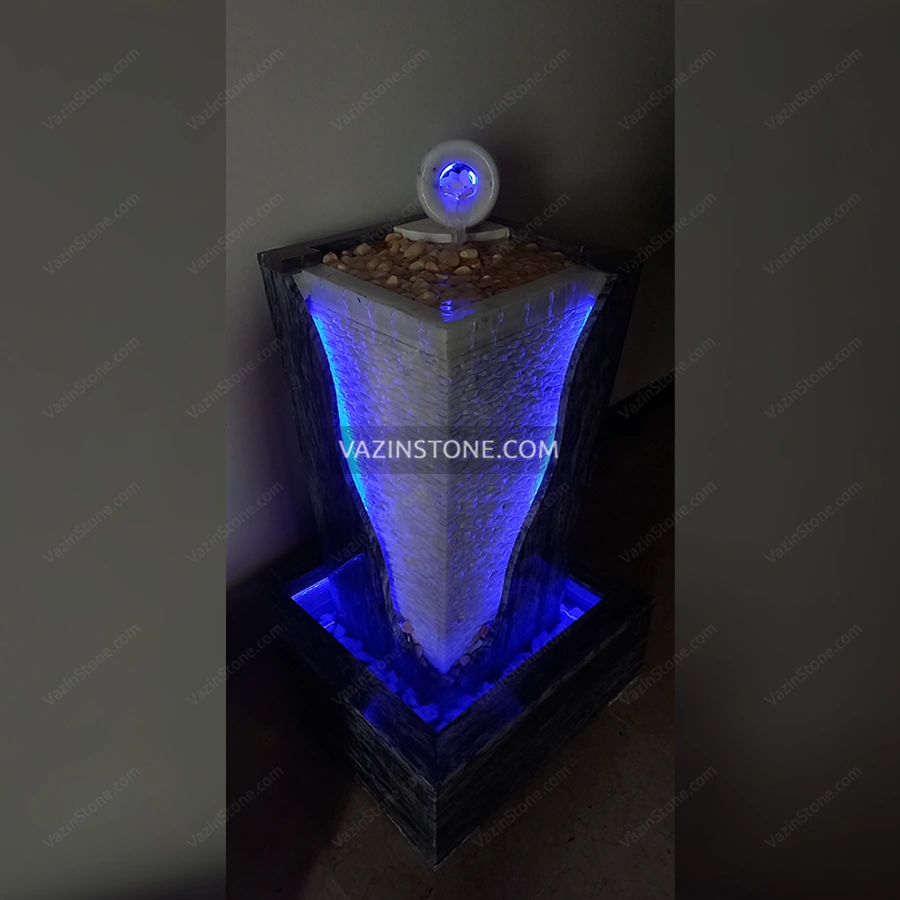 در بالای ستون نیز یک کوزه قرار گرفته است که نقشه سرچشمه آب بوده و پس از سرازیر شدن از آن وارد حوض بالایی و سپس بر روی دیواره ها و در انتها به حوض اصلی میریزد، برای ایجاد جلوه بیشتر می توانید از قلوه سنگ رودخانه ای سفید یا مشکی در قسمت حوض اصلی استفاده کنید. این کار باعث می شود که تاثیر نورپردازی دو چندان شود و بر زیبایی این آبنما می افزاید.