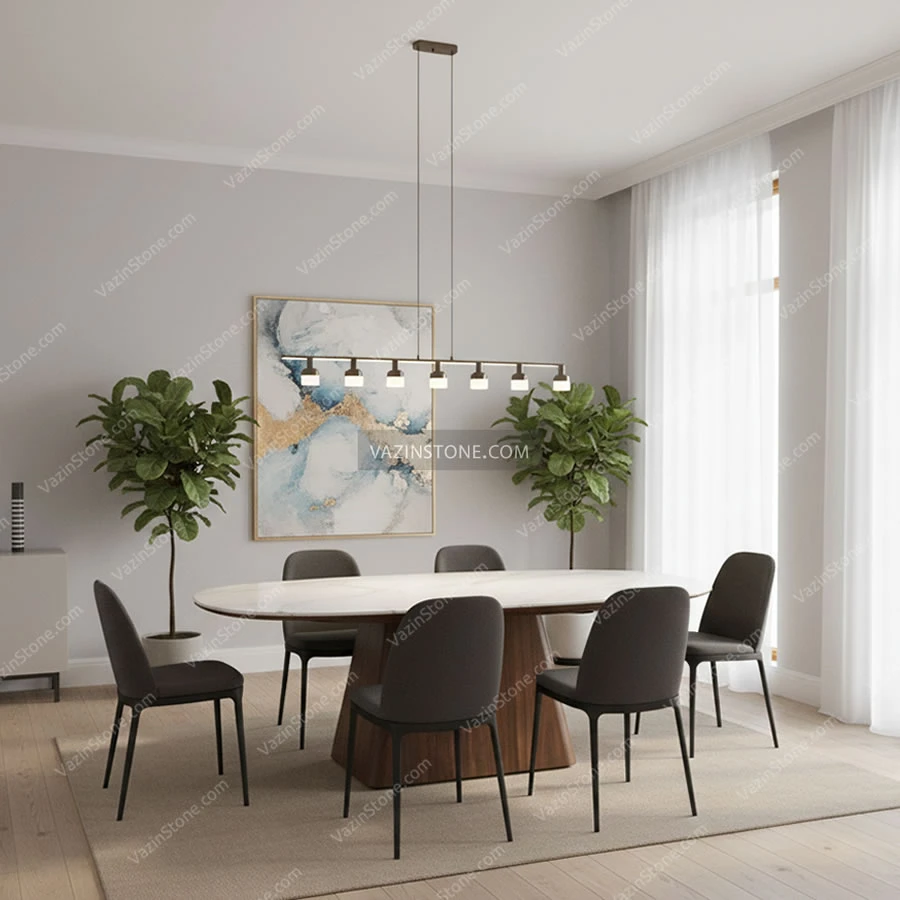 برای تکمیل زیبایی این میز ناهار خوری، امکان استفاده از اکسسوریهای سنگی مانند گلدان سنگی، شمعدان سنگی یا ظروف سنگی روی سطح میز وجود دارد که در کنار بافت طبیعی سنگ و گرمای چوب، جلوهای هماهنگ و لوکس به فضای غذاخوری میبخشند.