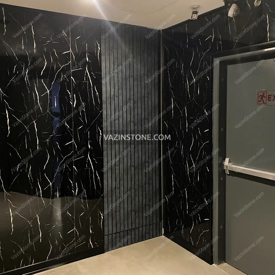 سنگ مصنوعی نجف آباد – ماربل شیت دارای زمینه ی کاملا مشکی همراه با رگه های سفید است. این ورق ماربل شیت یا تاپشیت دقیقا طرح و رنگی شبیه به سنگ مشکی نجف آباد دارد که میتوانید به صورت اسلب های بوک مچ و فورمچ در قسمت های مختلفی همچون دیوار پشت تلویزیون، دیوار لابی ساختمان و هتل ها، دیوار شرکت ها و ساختمان های لاکچری به کار برده و جلوه ی فضای خود را دو چندان نمایید.