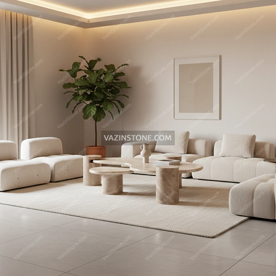 - از سنگ تراورتن موجدار با ساب معمولی در ساخت میز جلو مبلی سنگی برایکا استفاده شده است.