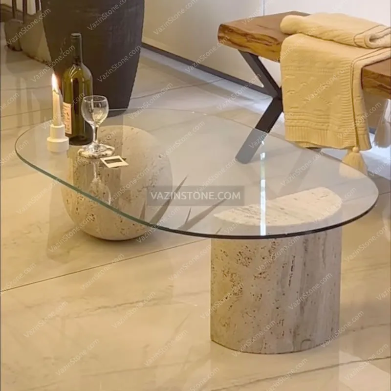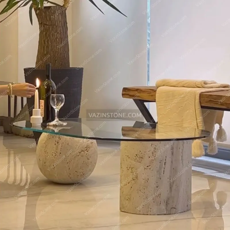 میز جلو مبلی سلین دارای پایه دو تیکه از جنس سنگ تراورتن بوده که یکی از پایه ها گوی شکل، و دیگری به صورت یک نیم دایره سنگی می باشد. رویه شیشه ای منحنی شکل این میز بر روی دو پایه سنگی آن قرار گرفته است. این میز جلو مبلی با طراحی فانتزی و سبک مدرن خود، برای استفاده در سالن های پذیرایی و نشیمن های بزرگ، انتخابی جذاب و متفاوت می باشد.