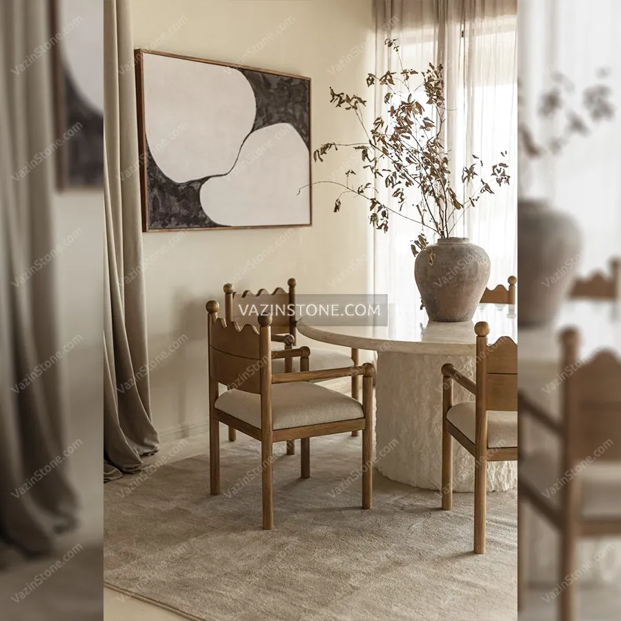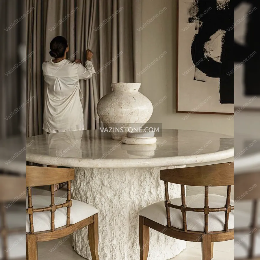 - میز ناهارخوری سنگی با زمینه کرم رنگ سنگ تراورتن.