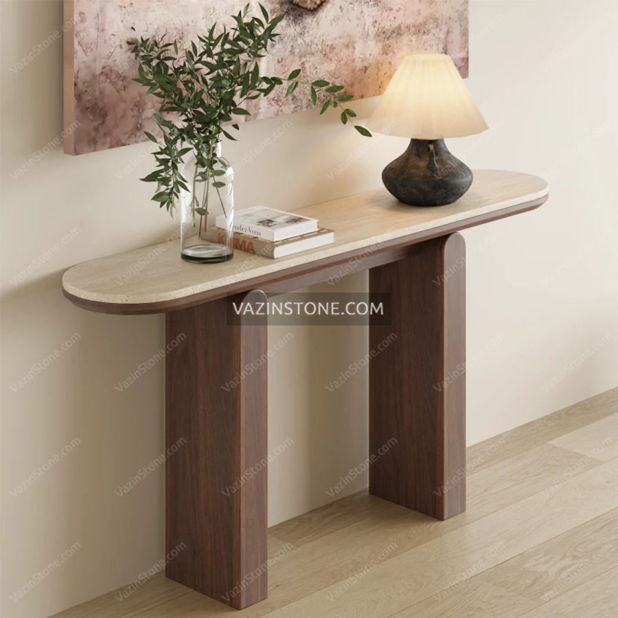 میز کنسول نویان ترکیبی هنرمندانه از چوب طبیعی و سنگ تراورتن است که ظاهری گرم، مدرن و لوکس ایجاد میکند. صفحه سنگی تراورتن با بافت طبیعی و مقاومت بالا، هویت اصلی این محصول را شکل میدهد و پایههای چوبی مستطیلی با طراحی ساده و استوار، ثبات و زیبایی بصری آن را تکمیل میکنند. همچنین قیدی که دو پایه را بهم متصل کرده، باعث افزایش استحکام کنسول نویان شده است. این کنسول سنگی برای فضاهای مدرن، کلاسیک و مینیمال انتخاب حرفهای محسوب میشود.