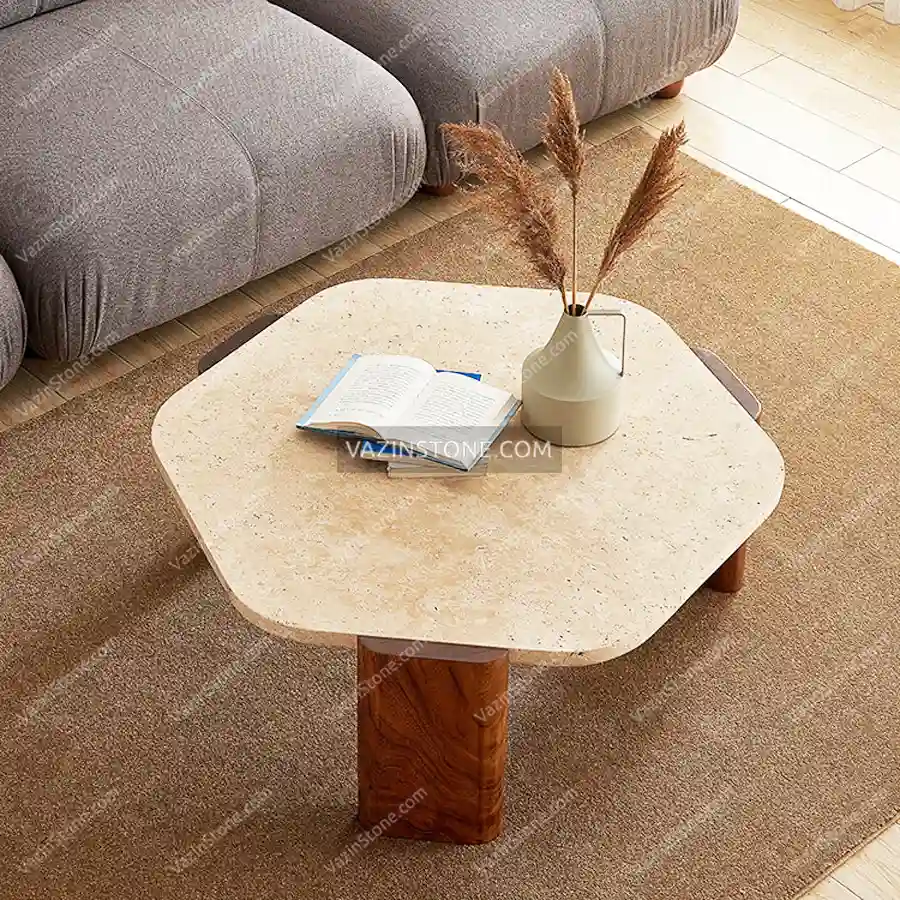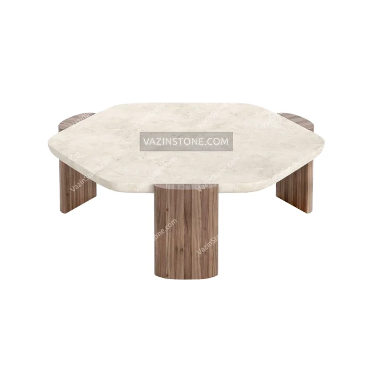 میز جلو مبلی ریوا از ترکیب جذاب متریال سنگ و چوب طبیعی، طراحی شده است. صفحهی میز به شکل ششضلعی طراحی شده و میتواند از دو سنگ تراورتن کرم و سنگ چینی سفید ساخته شود. پایهی سه تکه میز جلو مبلی از جنس چوب طبیعی بوده که در ابعاد ورقههای عمودی مستطیل شکل ساخته شدهاند. پایههای چوبی میز علاوه بر ایجاد هارمونی با رویه سنگی خود، پایداری و استحکام میز را نیز تضمین میکنند. میز جلو مبلی سنگ و چوب برای استفاده در فضاهای نشیمن با سبک مدرن و مینیمال انتخابی متمایز و ماندگار است.