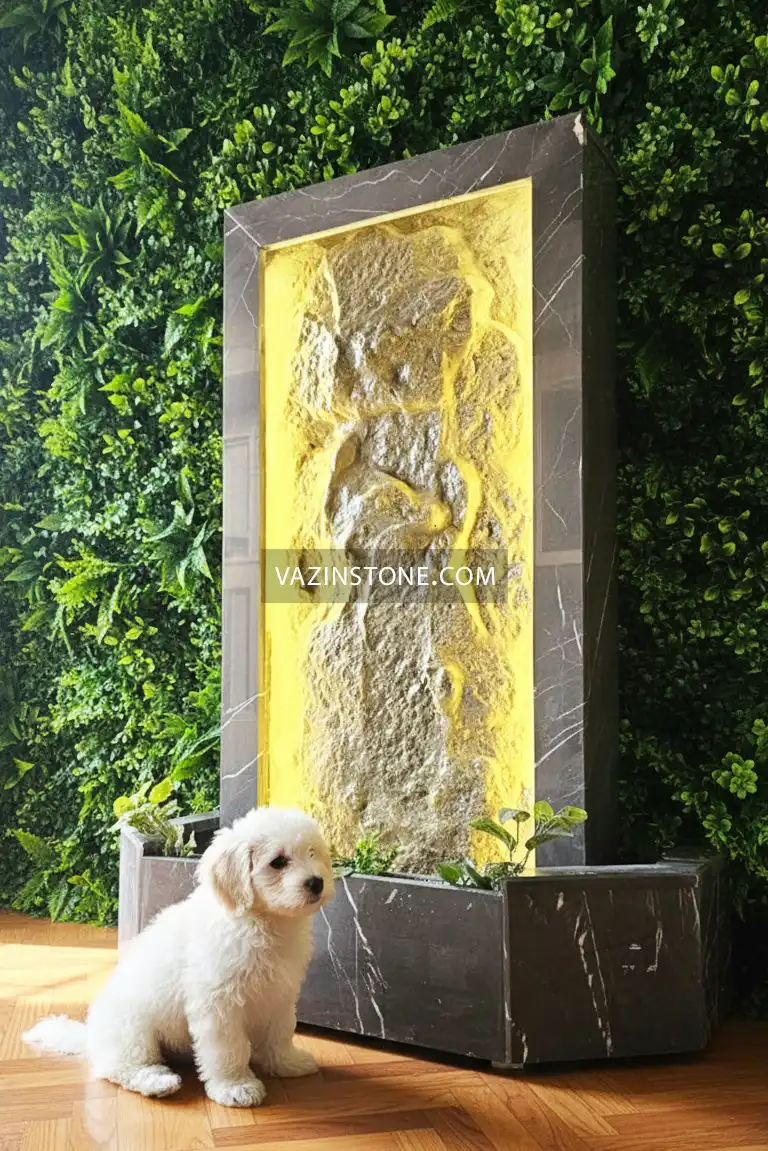 - استفاده از گرین وال در پشت دیوار آبنما به جهت افزایش جلوه و حس طراوت محیط