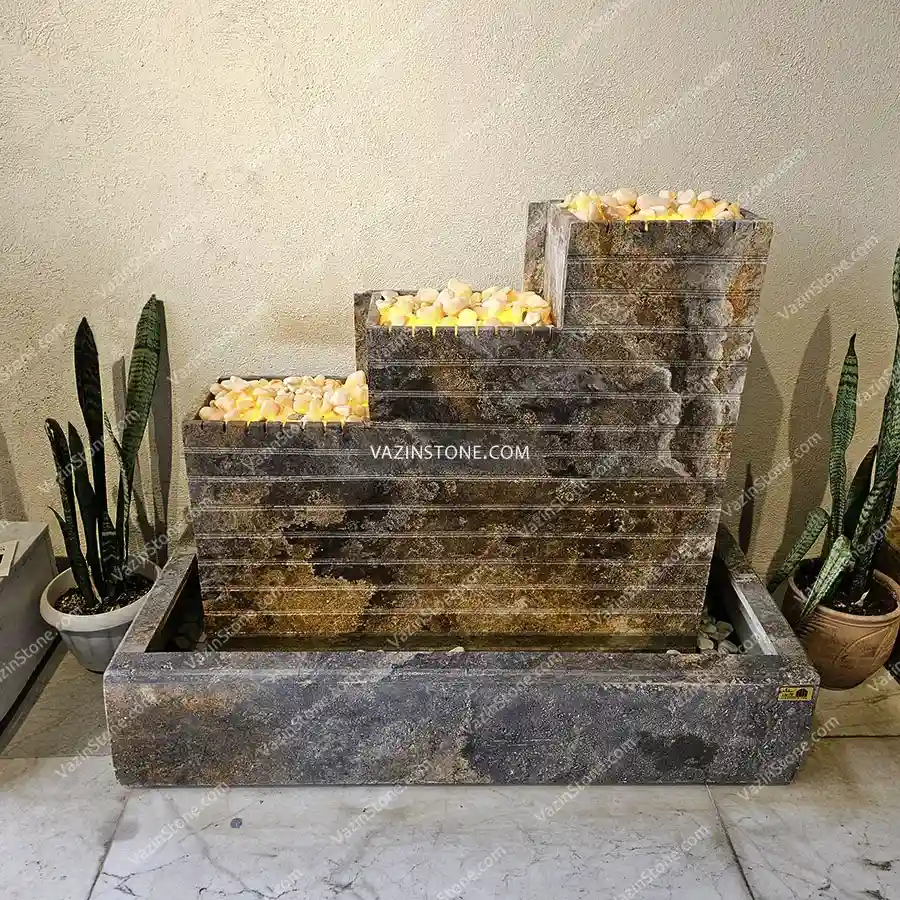 - نقش و نگار زیبای سنگ تراورتن بر روی زمینه طوسی رنگ آن، نما و سبکی مدرن برای این آبنما سنگی کوچک ایجاد کرده است.