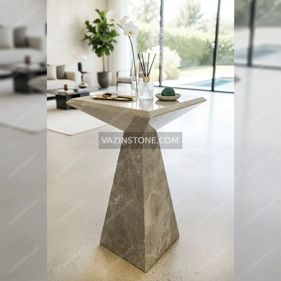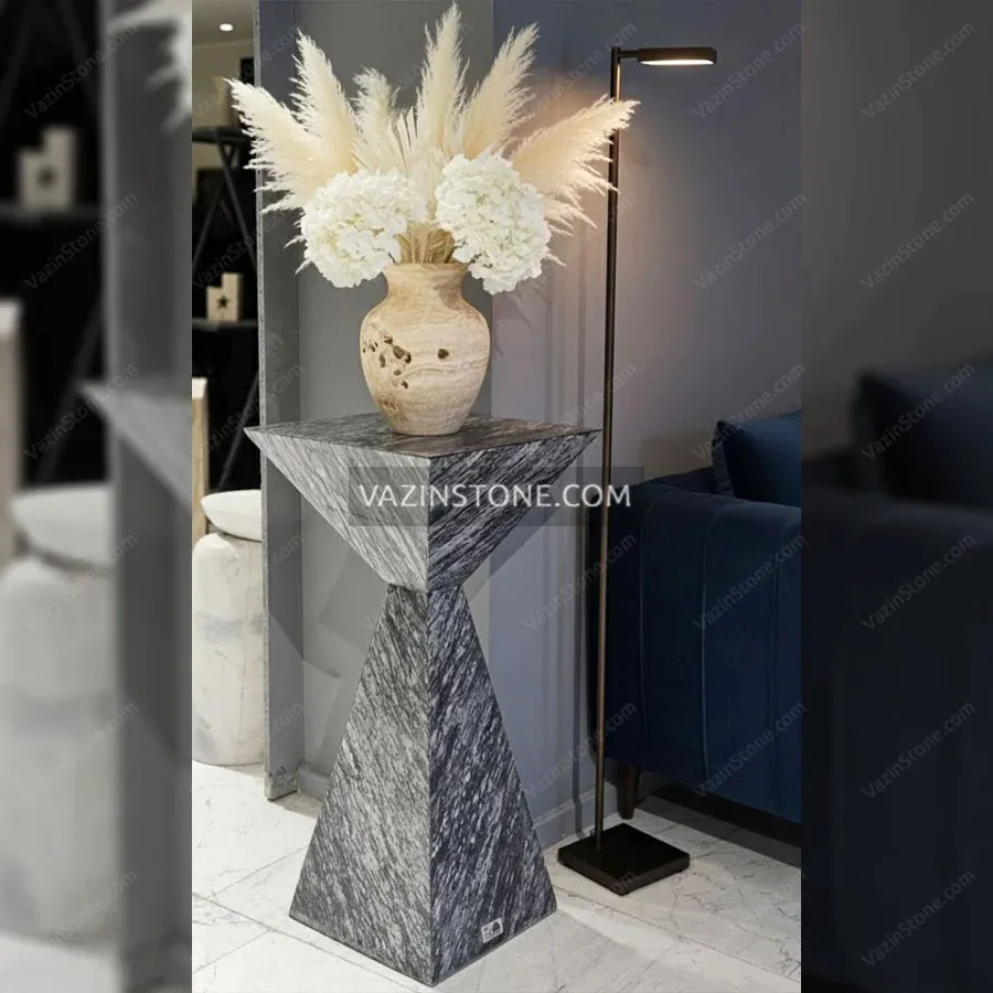 استند سنگی تیارا با طرحی شکیل و زیبا، قابل اجرا با سنگ مرمریت پرشین سیلک و مرمریت بلک فیوژن، سبکی مدرن، کاربری به عنوان استند و میز خاطره، مناسب قرارگیری لوازم دکوری چون مجسمه، ظروف سنگی، گلدان و قاب عکس