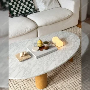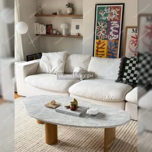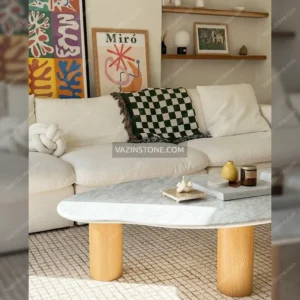 - میز سنگی با پایه چوبی دارای سبک مدرن و مینیمال.