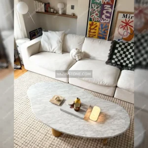میز جلو مبلی ویلدا با طراحی خاص خود، ترکیبی از سنگ و چوب طبیعی را در قالبی مدرن و منسجم به نمایش میگذارد. صفحهی این میز از سنگ چینی با زمینه سفید رنگ و رگههای طوسی ملایم ساخته شده و دارای فرم منحنی و غیرمتقارنی است که آن را از حالت کلاسیک بیضی یا دایره متمایز میکند. پایههای این میز از جنس چوب طبیعی بوده و شامل دو پایه استوانهای و یک پایه مستطیلی شکل است که به صورت غیریکنواخت در زیر صفحه قرار گرفتهاند و فرم نامتقارن میز را تکمیل کردهاند. طراحی این میز جلو مبلی به گونهای است که ضمن حفظ عملکرد کاربردی، ظاهری متمایز و جذاب در فضا ایجاد میکند.